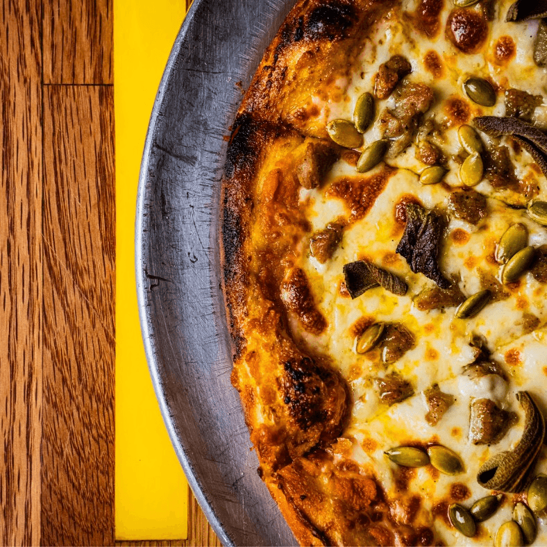 pumpkin purée base topped with pork sausage, a gruyere-mozzarella blend, crispy sage leaves, and a brown butter drizzle