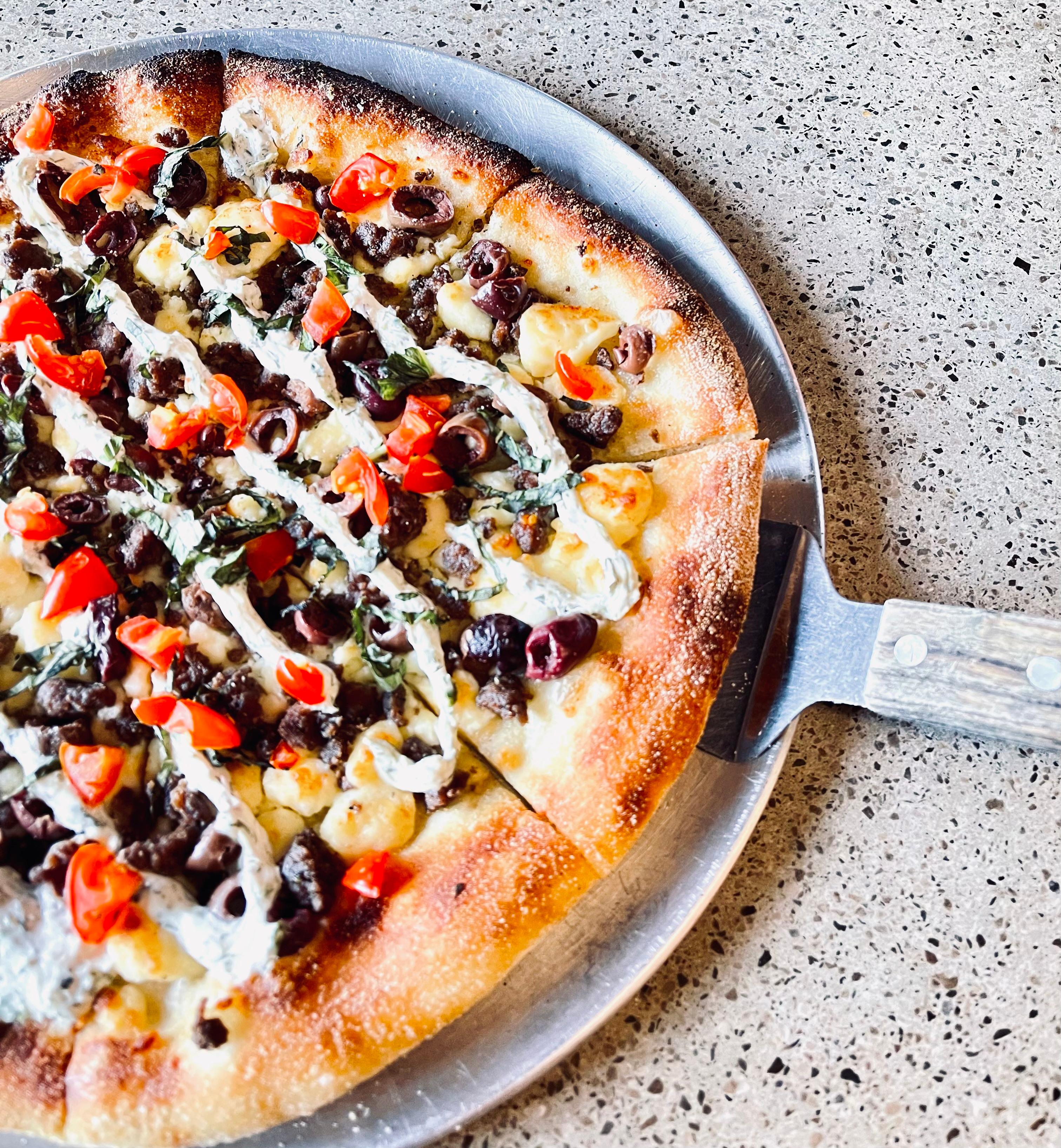 Pizza bianco with roasted garlic, caramelized onions, appalachian unveiled wild mushrooms, goat cheese, arugula, pecans and finished with truffle oil. Recommended Wine Pairing: Quattro Quarti, Nero Recommended Wine pairing Vento di Mare Nero D'Avola , Pinot Noir